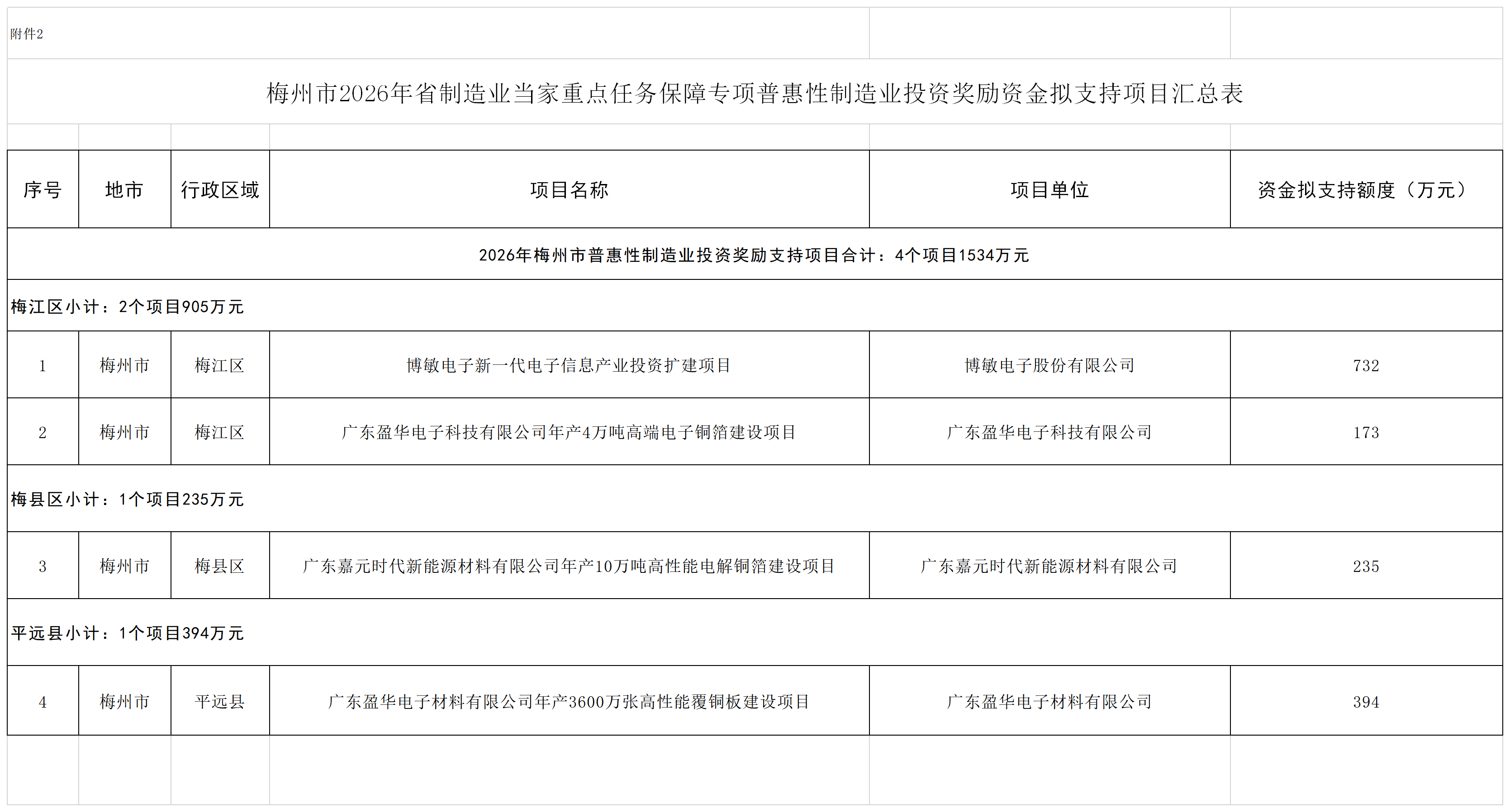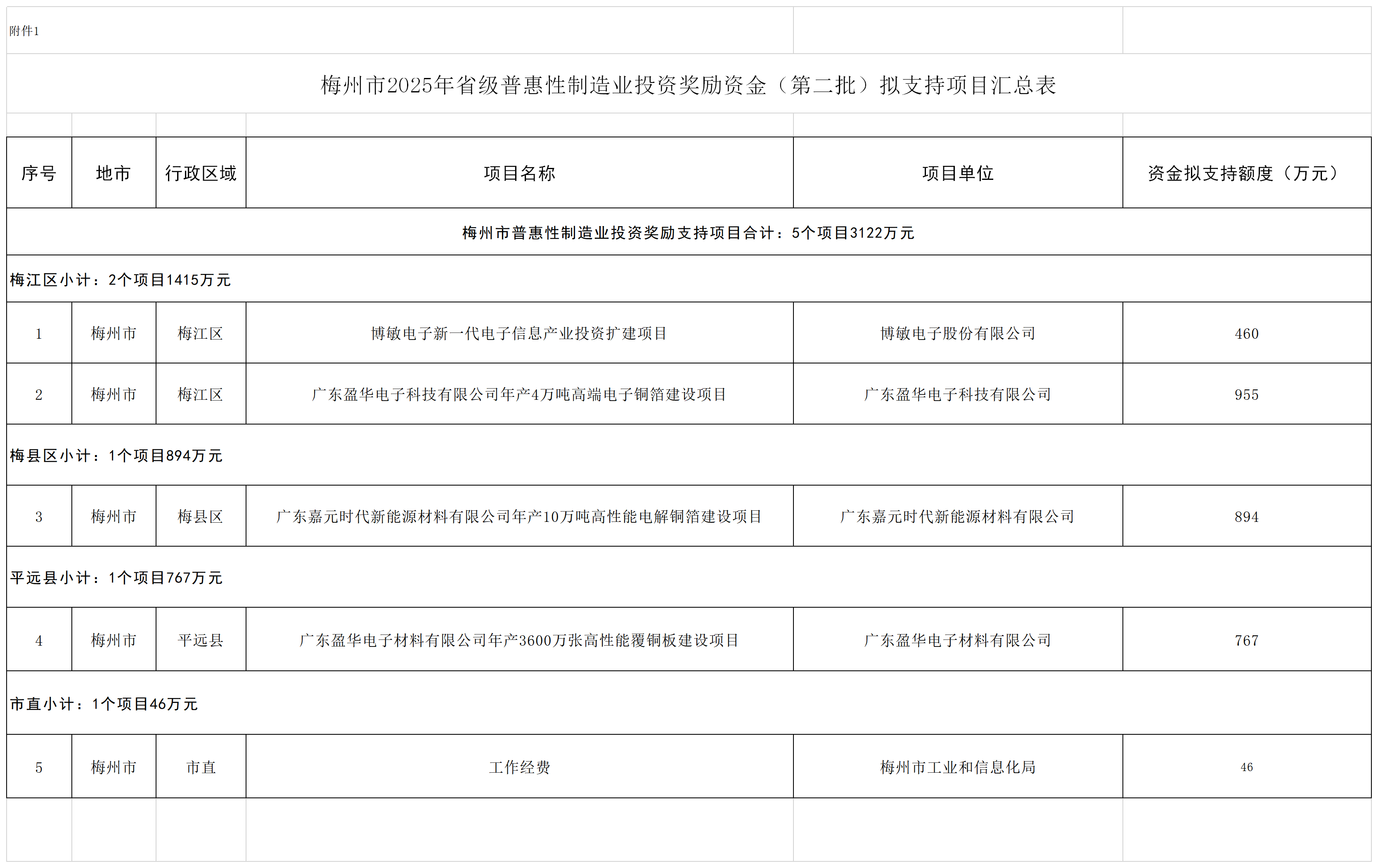 附件:1.梅州市2025年省制造业当家重点任务保障专项普惠性制造业投资奖励资金(第二批)拟支持项目汇总表