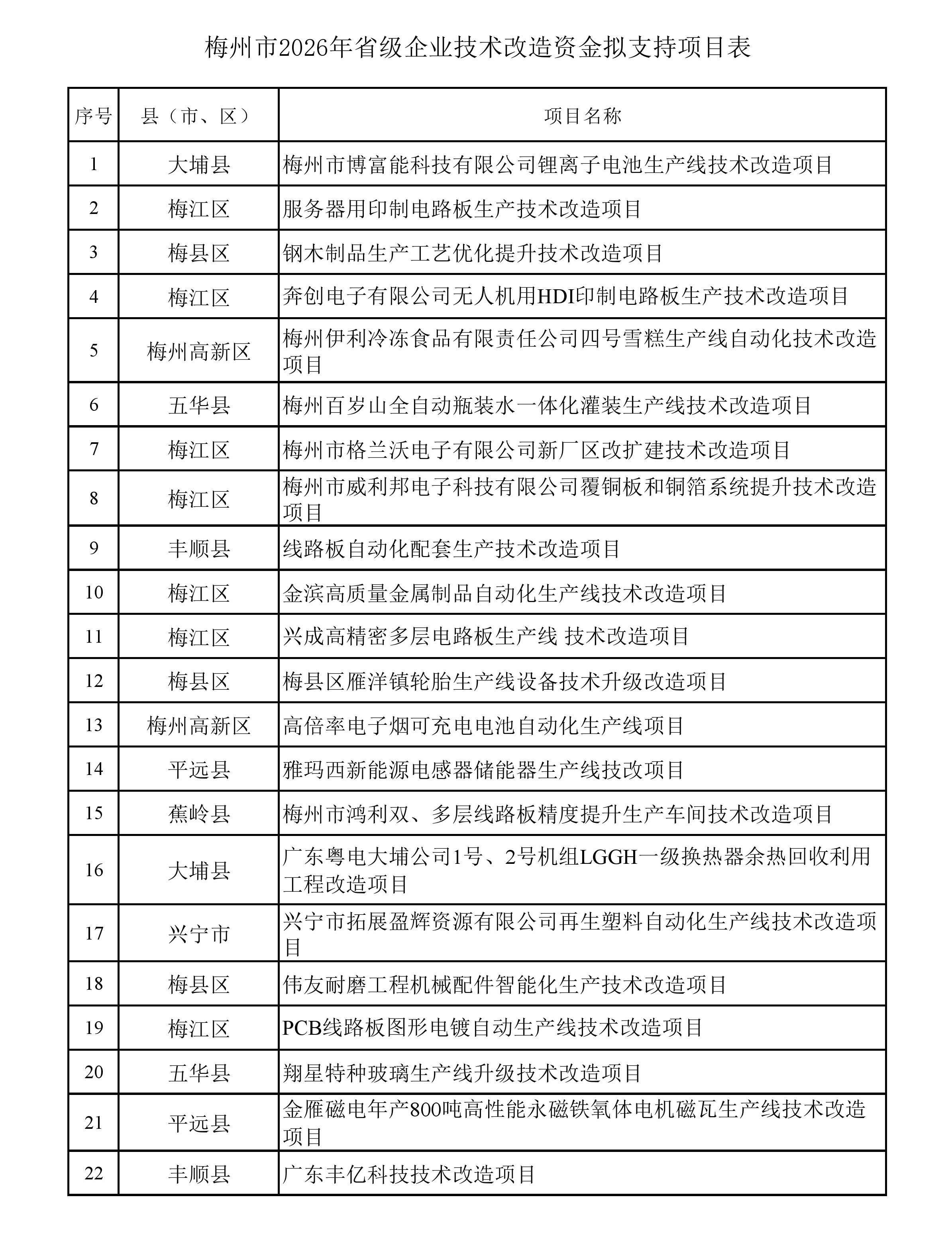 关于梅州市2026年省级企业技术改造资金拟支持项目的公示