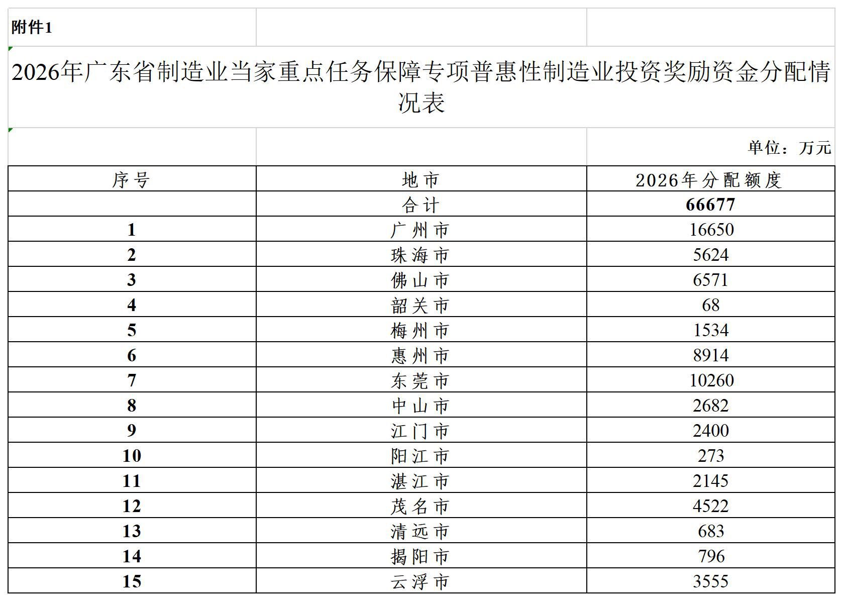 附件:1.2026年广东省制造业当家重点任务保障专项普惠性制造业投资奖励资金分配额度表