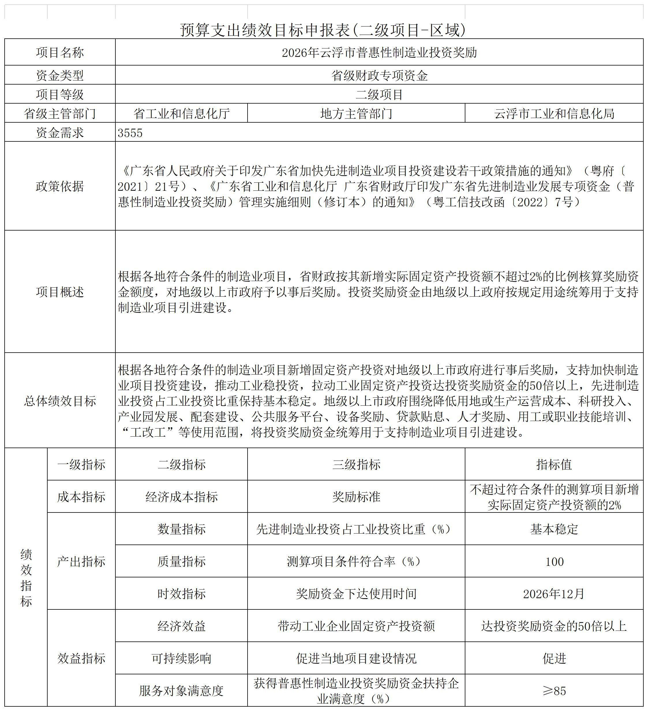 2.2026年广东省制造业当家重点任务保障专项普惠性制造业投资奖励资金绩效目标表