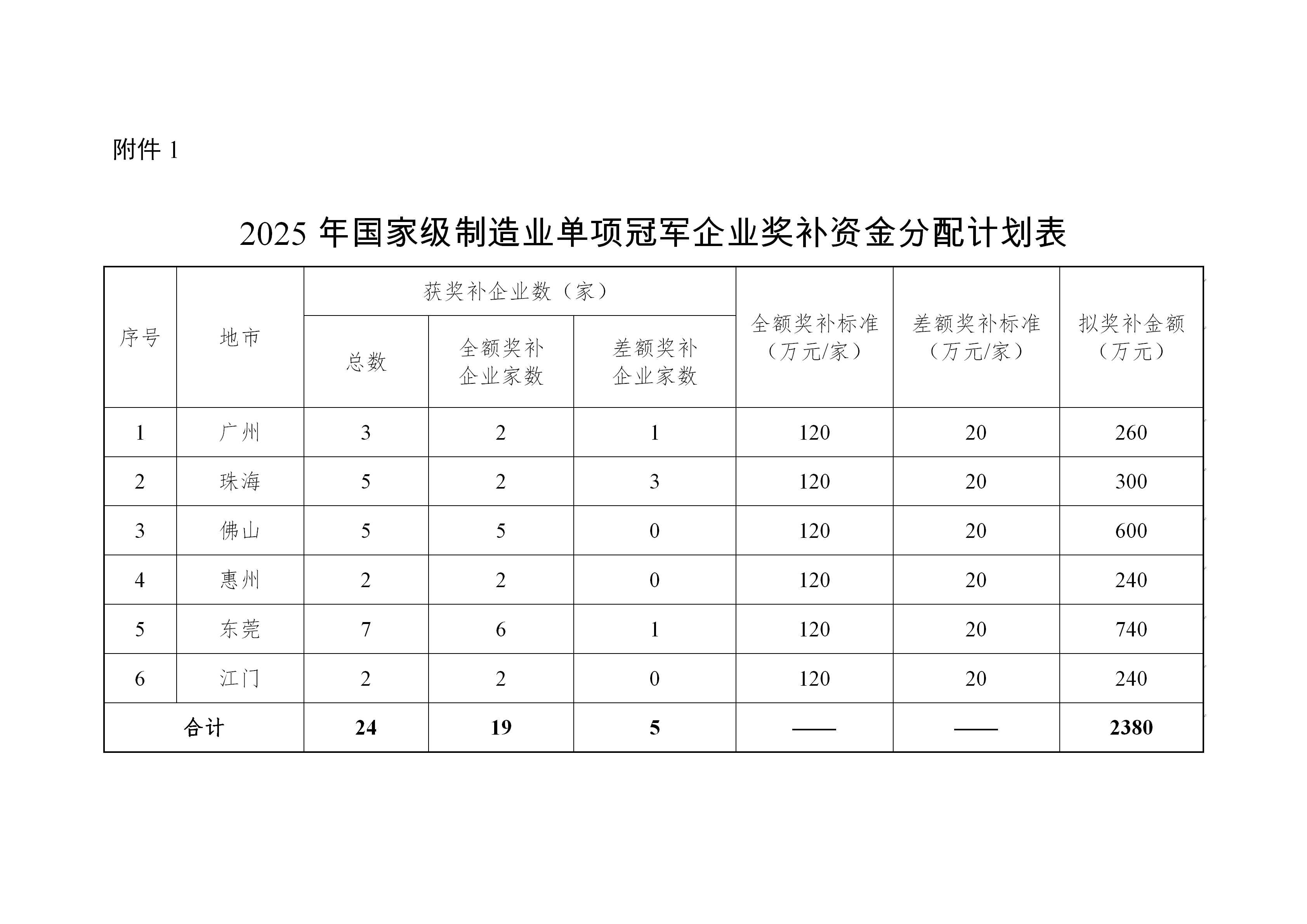 附件:1.2025年国家级制造业单项冠军奖补资金分配计划表