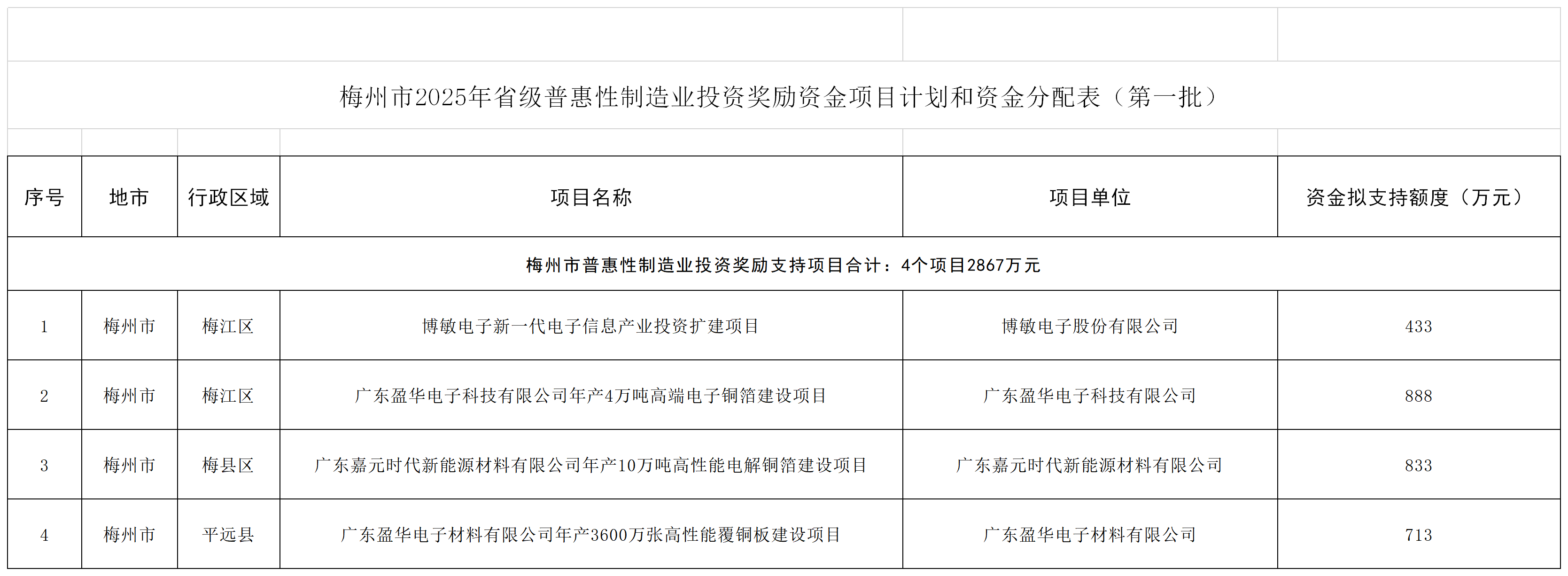 根据《广东省工业和信息化厅关于下达2026年广东省制造业当家重点任务保障专项普惠性制造业投资奖励资金项目计划的函》(粤工信技改函〔2026〕2号)、《广东省工业和信息化厅关于下达2025年广东省制造业当家重点任务保障专项普惠性制造业投资奖励资金(第二批)项目计划的函》(粤工信技改函〔2026〕3号)及相关规定,市工业和信息化局形成了梅州市2025年省制造业当家重点任务保障专项普惠性制造业投资奖励资金(第二批)和2026年省制造业当家重点任务保障专项普惠性制造业投资奖励资金拟支持项目,并按有关规定予以公示。
