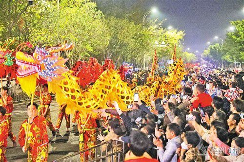 舞龙游行队伍经过学海路,市民争相观看。(吴腾江 摄)